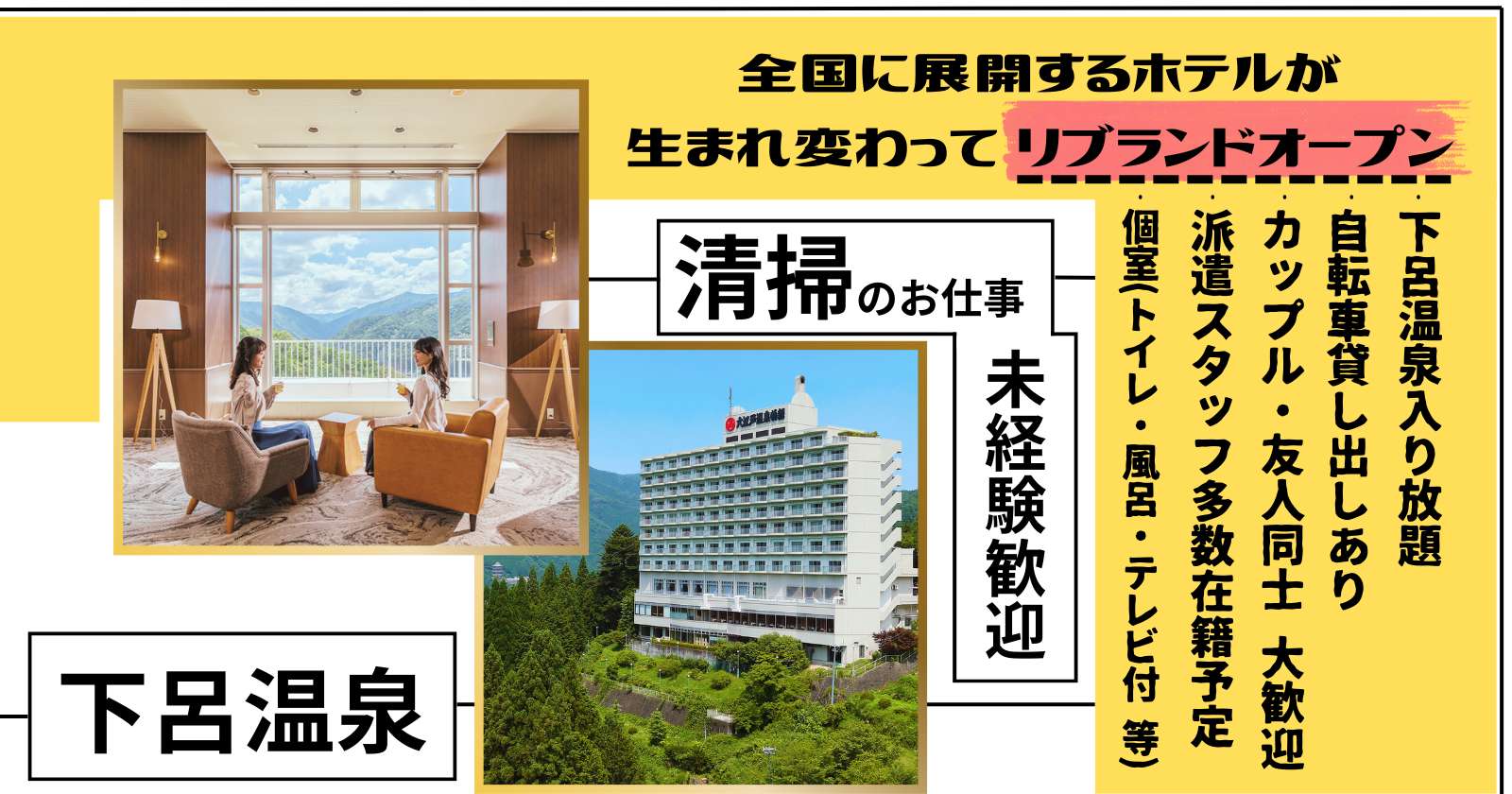 岐阜県下呂温泉のリゾートホテルで時給1,200円、清掃の住み込みリゾートバイト!(求人No.508822)