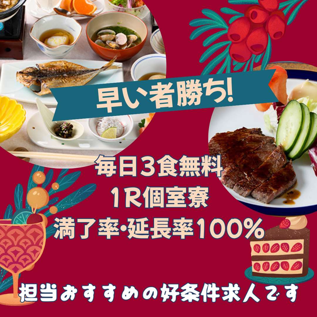 ・滞在期間中はビジネスホテルの1室を貸与 ・寮費食費水光熱費無料 ・短期OK ・大浴場利用可能 ・交通費最大50,000円支給 ・持参物少な目 ・未経験OK ・制服貸与 etc...