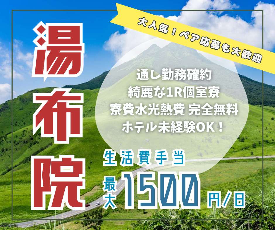 大分県湯布院のリゾートホテルで時給1,300円、全般業務の住み込みリゾートバイト!(求人No.552695)